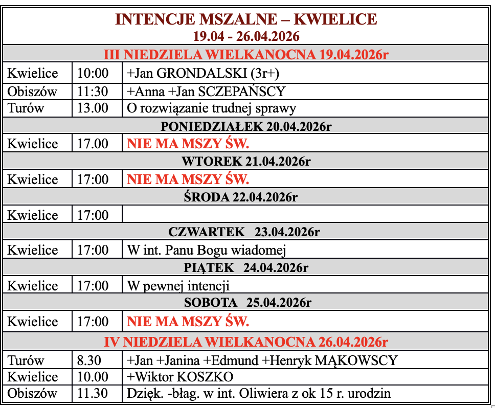 Zapraszamy do zapoznania się z intencjami mszalnymi na nadchodzący tydzień: